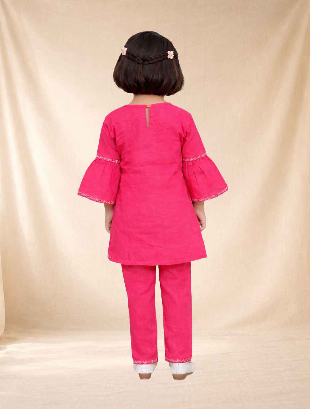 Cheerful, soft cotton casual set for girls in a lovely pink shade. This knee-length kurta features elegant bell sleeves, paired with matching trousers—crafted for playful style, comfortable cuts, and everyday ease.