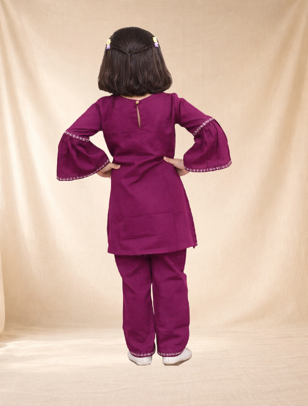 Cheerful, soft cotton casual set for girls in a rich purple shade. This kurti features elegant bell-style sleeves, paired with a matching palazzo—designed for playful comfort, easy movement, and all-day wear.
