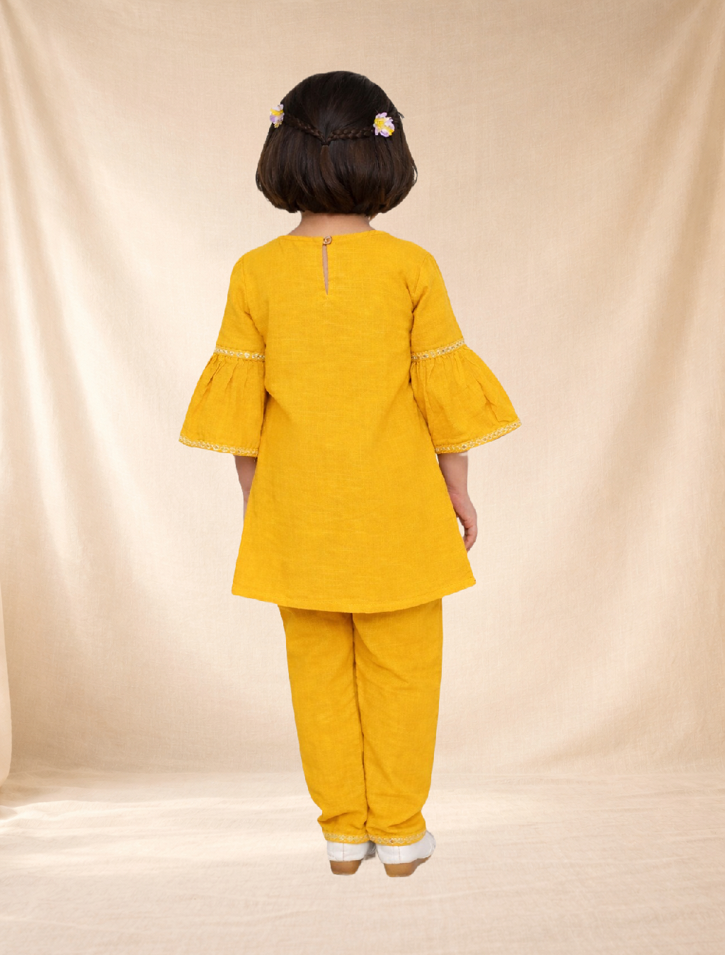Cheerful, soft cotton casual set for girls in a vibrant mustard yellow shade. This kurta features stylish bell sleeves, paired with matching trousers—offering playful charm, comfortable cuts, and effortless wear for every kind of day.