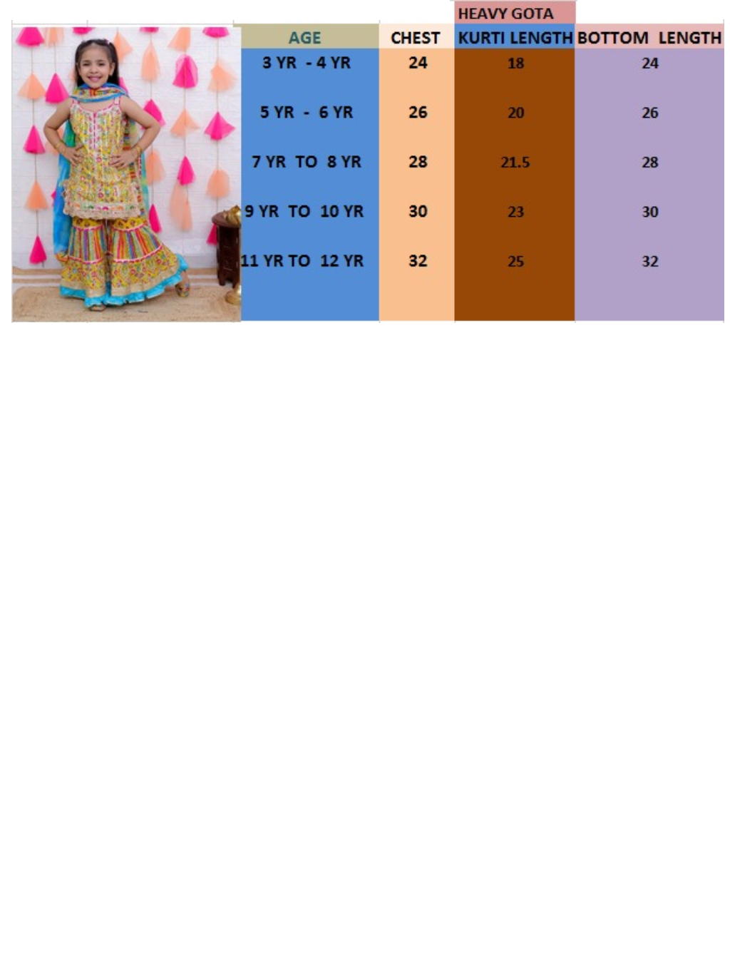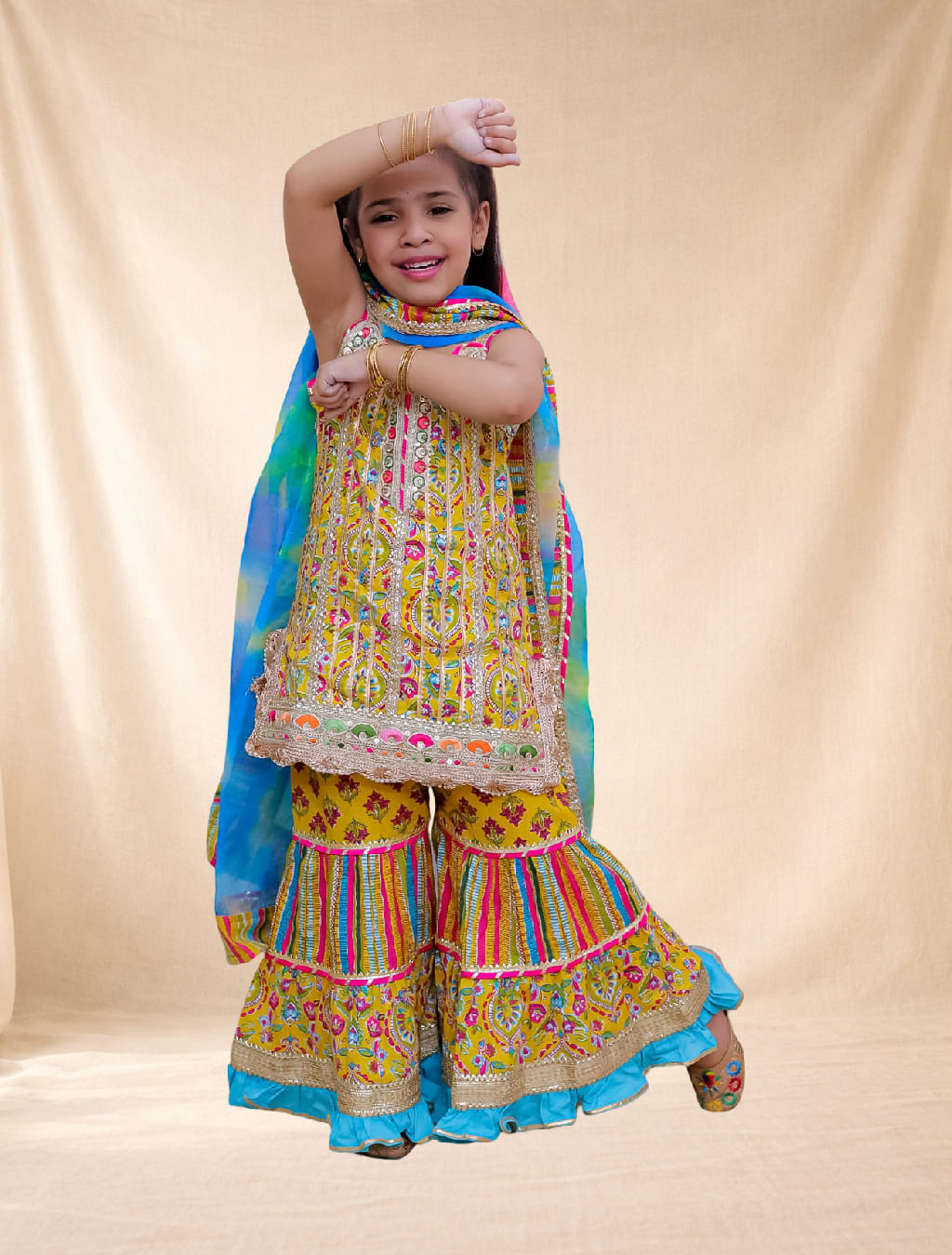 Yellow ethnic ensemble for girls is a 3-piece Sharara set, featuring a sleeveless short kurti, matching sharara pants, and a contrasting blue tie-dye dupatta.